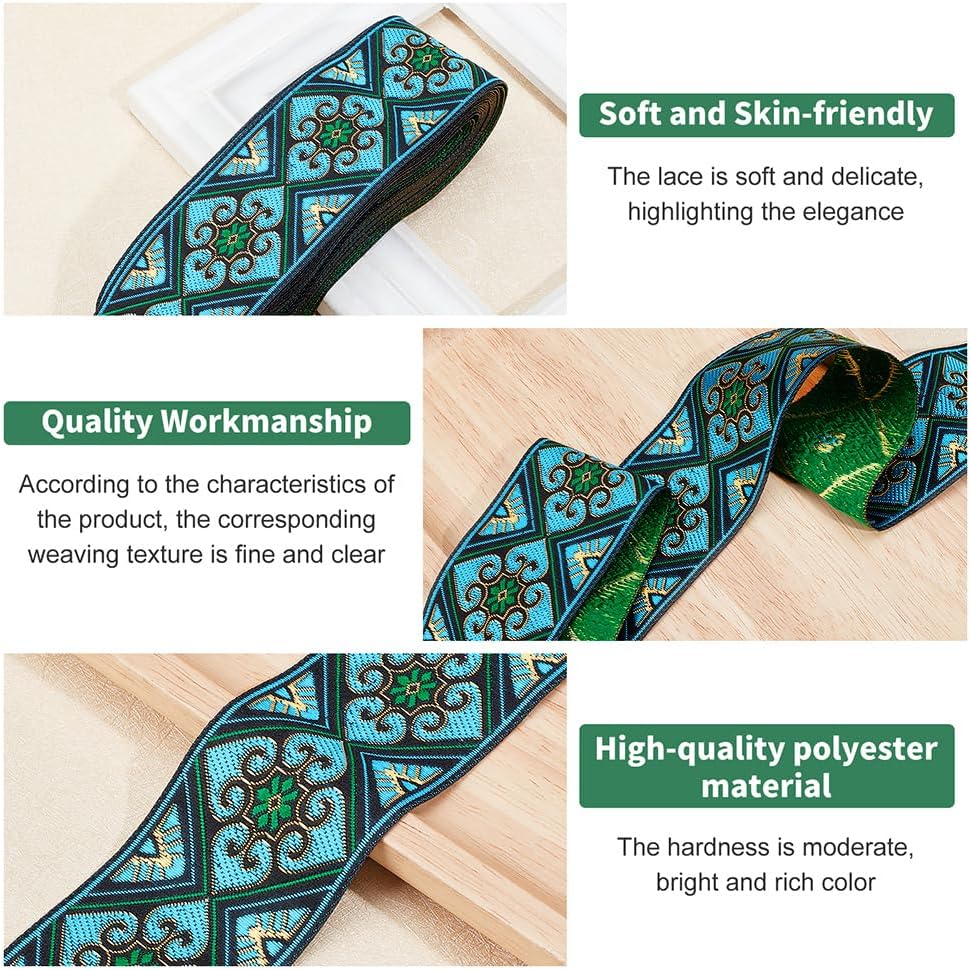 - Embroidered Woven Ribbon: Green ribbon with flower and geometric pattern, in ethnic and exotic style typically, has great texture, easy to sew on clothing in various style, it is very detailed, colorful and picturesque.