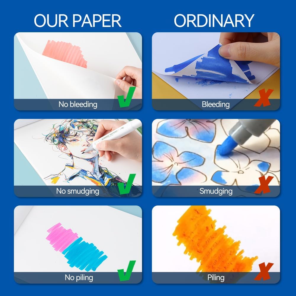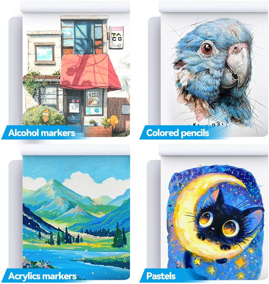 - This pad is versatile, suitable for different medium, support alcohol markers, acrylics markers, watercolors, gouache, inks, pencils and pastels, etc.